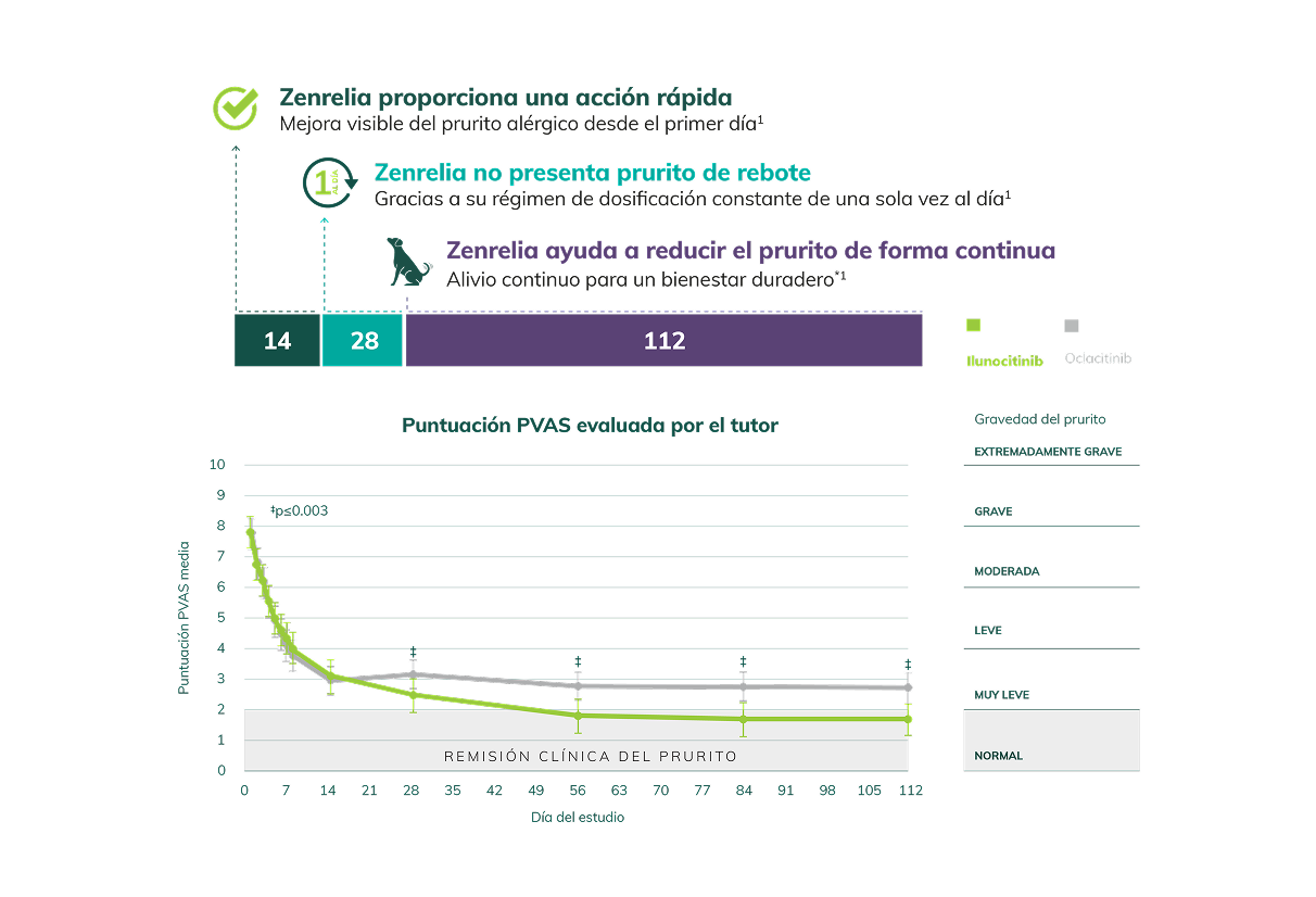 Zenrelia reduce el prurito y mejora las lesiones cutáneas, ofreciendo una eficacia mejorada, en comparación con oclacitinib1