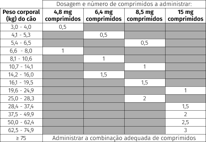 Instruções com vista a uma administração correta: Estes comprimidos podem ser administrados com ou sem alimentos. Contraindicações: Não administrar a cães com evidência de imunossupressão. Não administrar em caso de hipersensibilidade à substância ativa ou a algum dos excipientes. Eventos adversos: Cães: