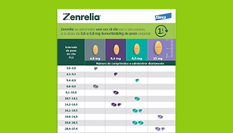 Nome do medicamento veterinário: Zenrelia 4,8 mg comprimidos revestidos por película para cães. Zenrelia 6,4 mg comprimidos revestidos por película para cães. Zenrelia 8,5 mg comprimidos revestidos por película para cães. Zenrelia 15 mg comprimidos revestidos por película para cães. Titular da A.I.M: Elanco GmbH. Composição: Cada comprimido revestido por película contém: Substância ativa: 4,8 mg de ilunocitinib. 6,4 mg de ilunocitinib. 8,5 mg de ilunocitinib. 15 mg de ilunocitinib. Espécies alvo: Caninos (cães). Indicações de utilização para cada espécie-alvo: Tratamento do prurido associado a dermatite alérgica em cães. Tratamento de manifestações clínicas de dermatite atópica em cães. Posologia e via de administração: Via oral. A dose recomendada é de 0,6 a 0,8 mg de ilunocitinib /kg peso corporal, administrado uma vez por dia. A necessidade de um tratamento de longo prazo deve basear-se numa avaliação individual de benefício/risco realizada pelo médico veterinário responsável. Os comprimidos podem ser administrados com ou sem alimentos. A seguinte tabela de dosagem indica o número de comprimidos necessários. Os comprimidos podem ser fracionados pela ranhura existente a meio.