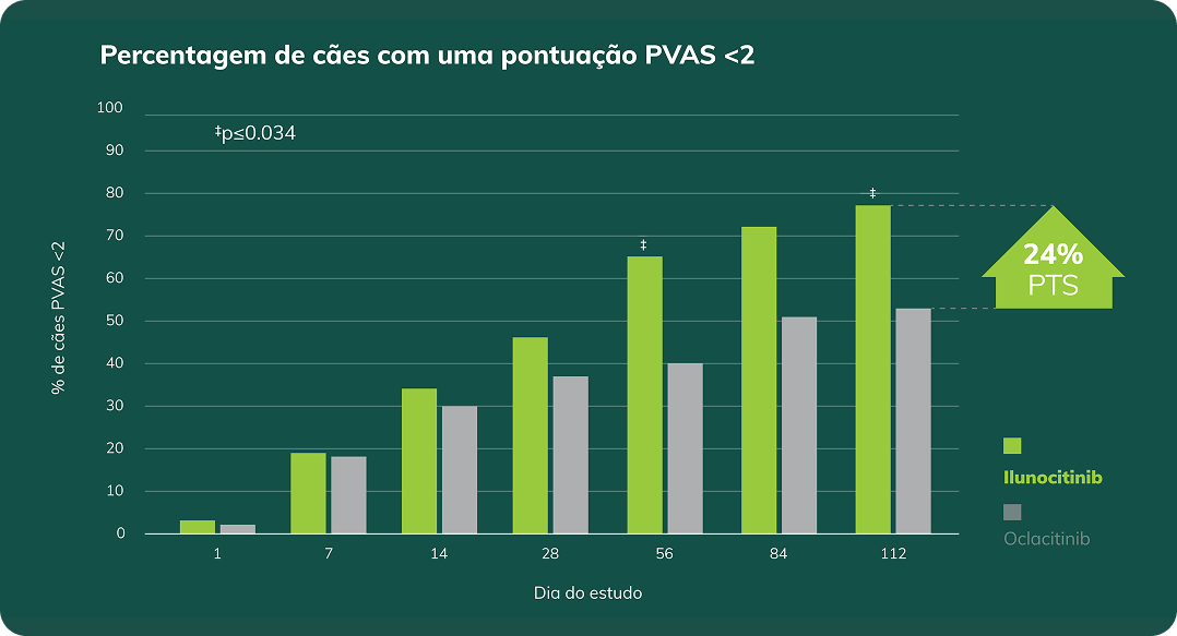 77% dos cães atingiram remissão clínica do prurido, vs 53% dos cães tratados com oclacitinib1