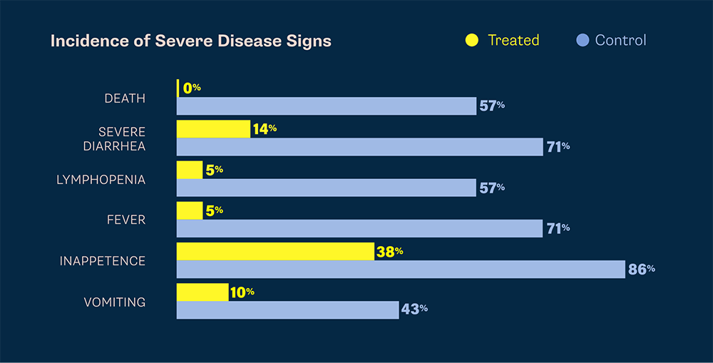 After challenged with virulent CPV-2b, zero dogs died when treated with Canine Parvovirus Monoclonal Antibody.3